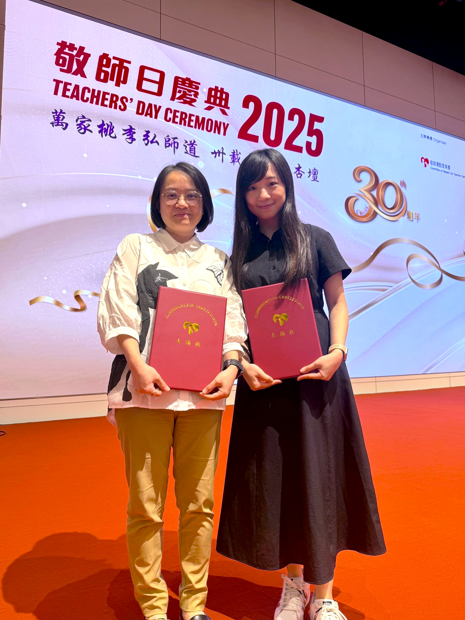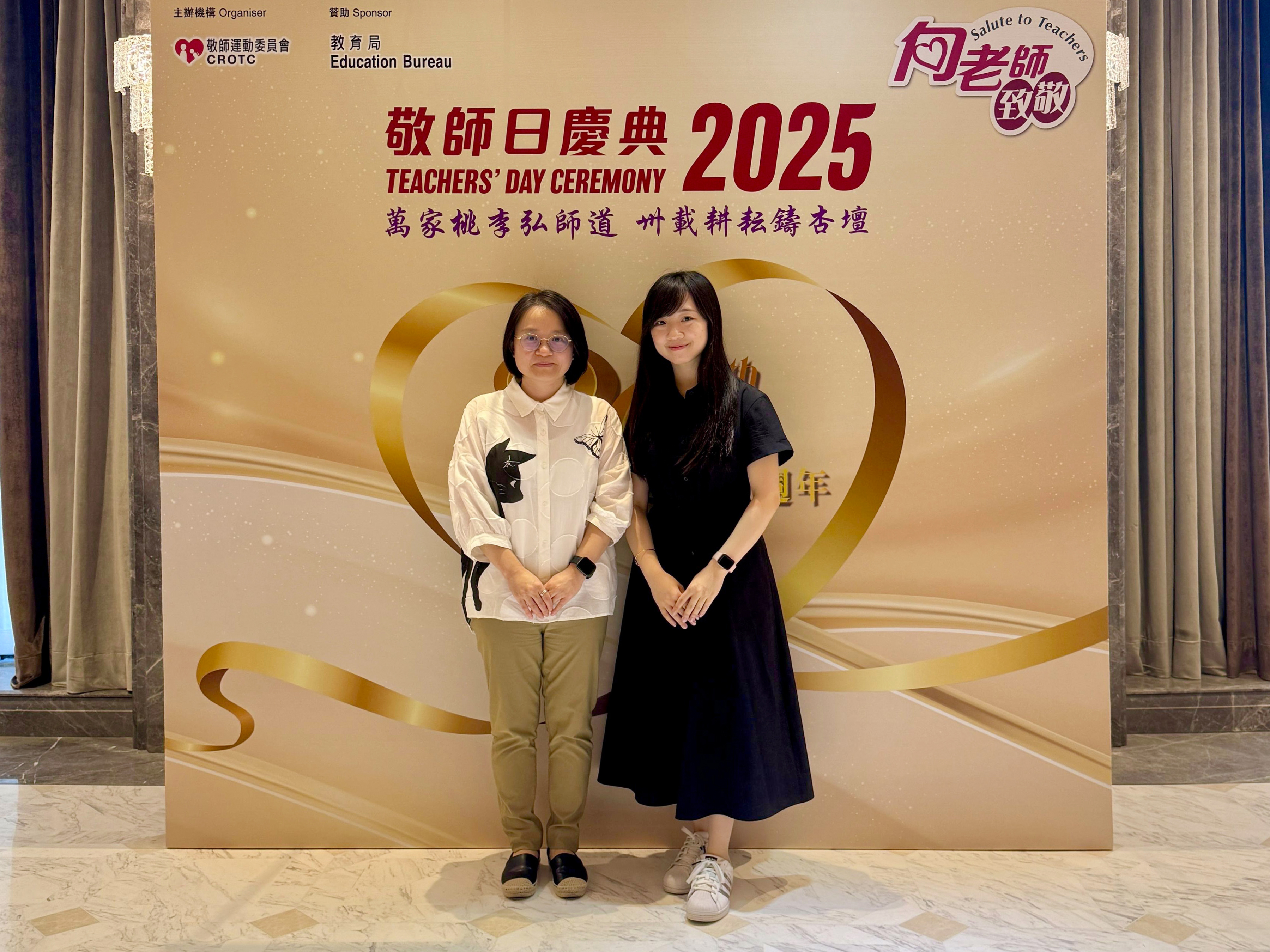 今天,兩位老師出席了隆重的「敬師日慶典暨表揚狀頒發典禮」,