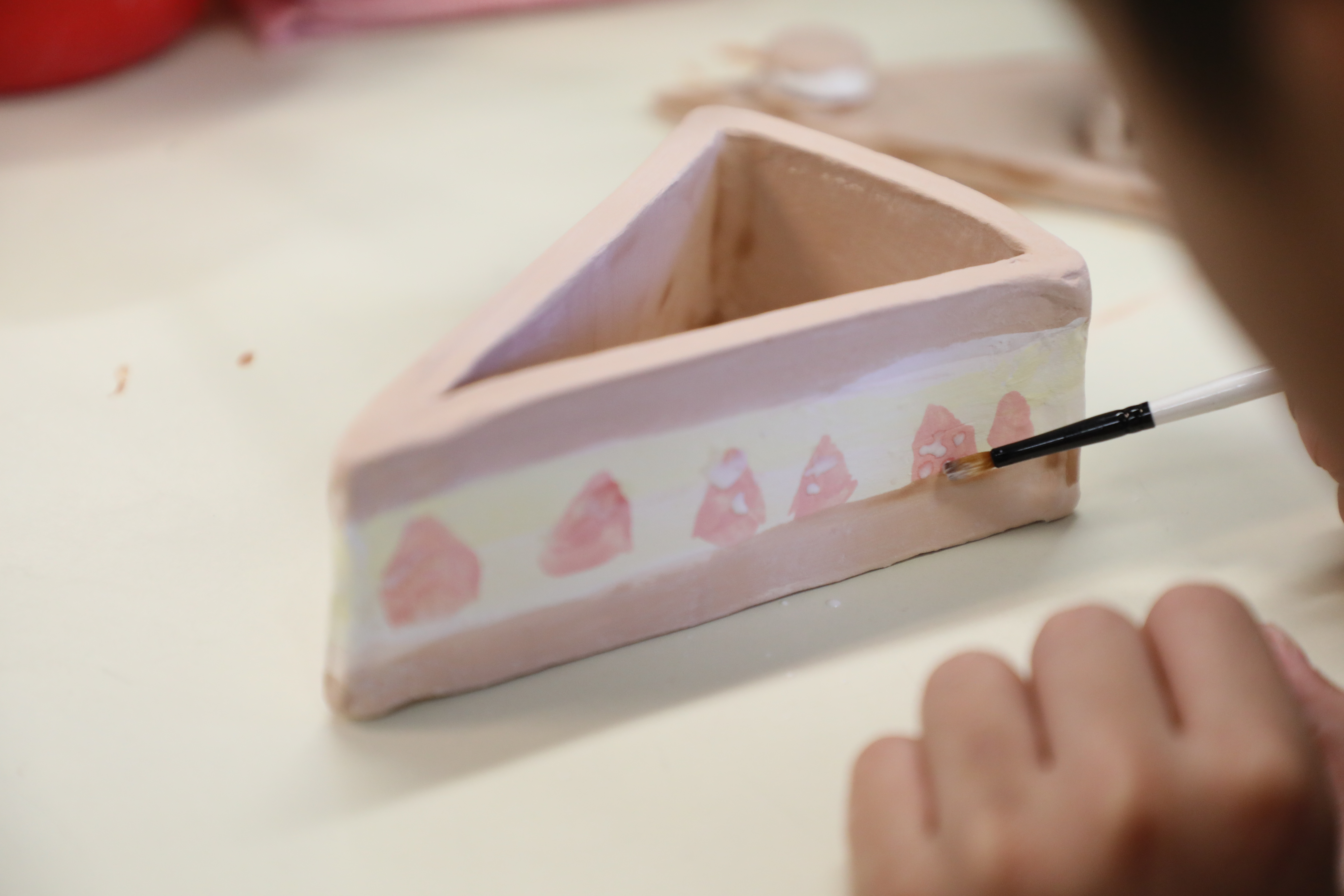 過程整整花了一個多月,從碌泥板、紙模切割、接駁造型, 到陶泥裝飾、泥漿唧花 —— 每個蛋糕盒都蘊藏驚喜與創意: 有巧克力口味、草莓口味,還有「令人會心一笑」的獨特造型。
