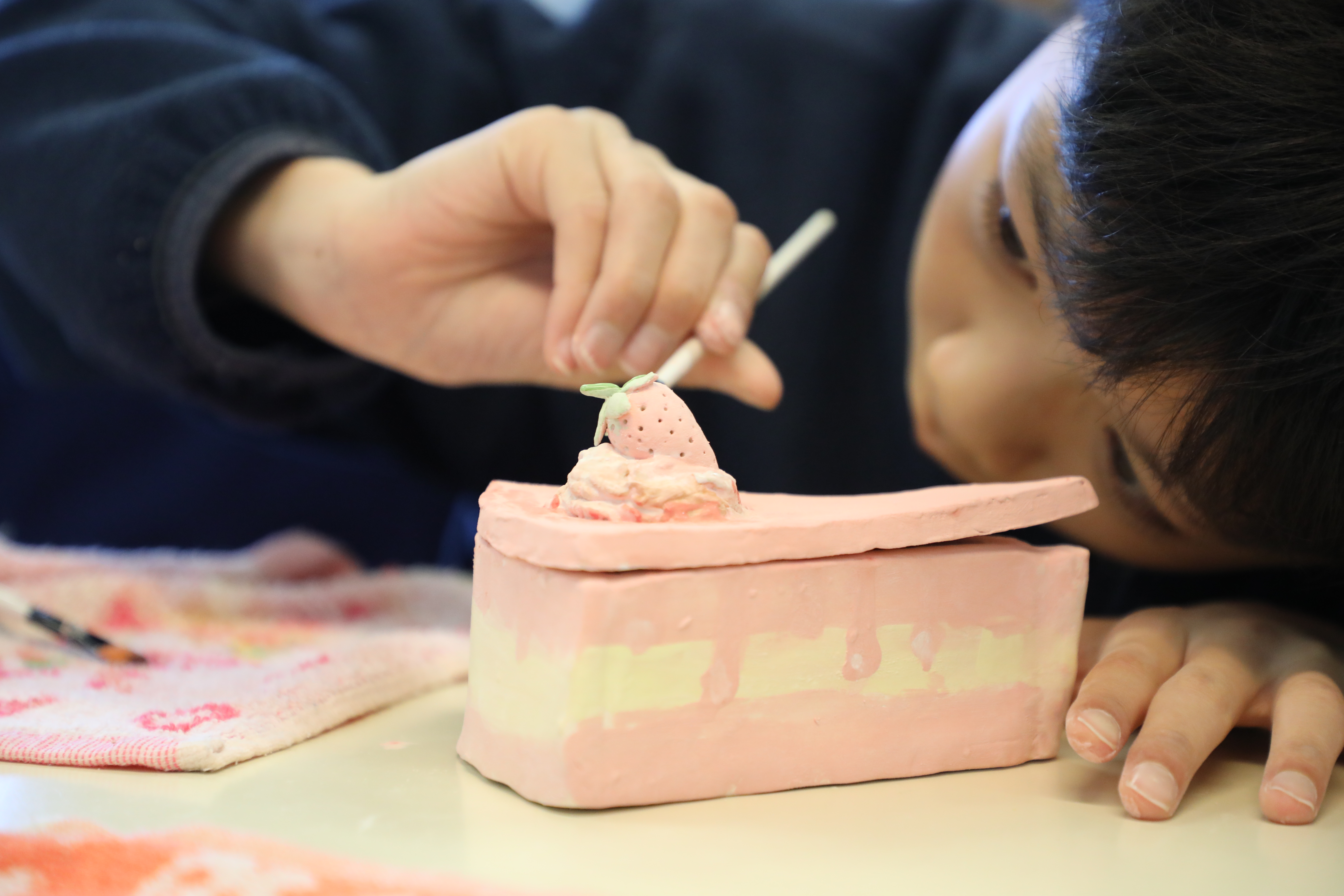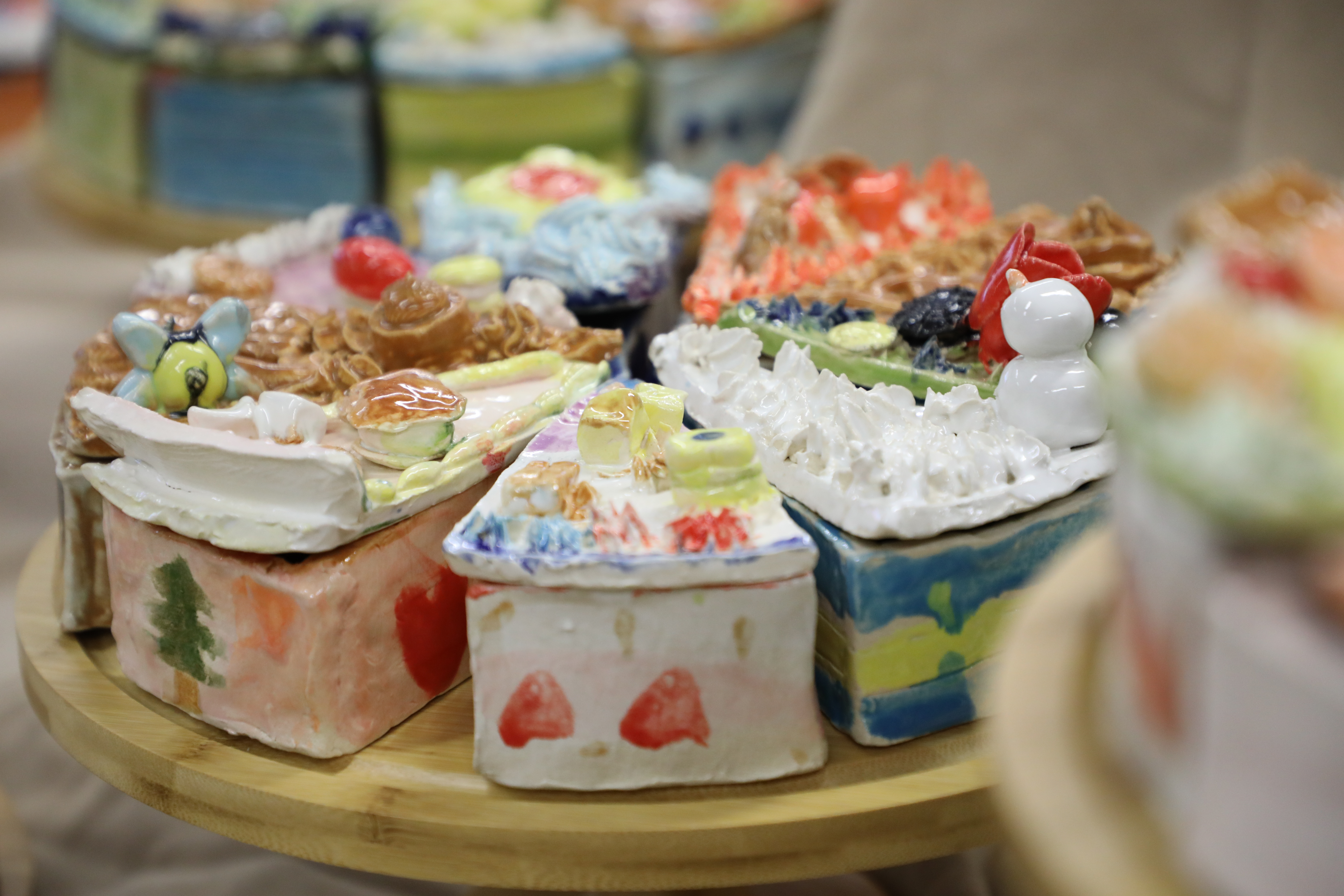 過程整整花了一個多月,從碌泥板、紙模切割、接駁造型, 到陶泥裝飾、泥漿唧花 —— 每個蛋糕盒都蘊藏驚喜與創意: 有巧克力口味、草莓口味,還有「令人會心一笑」的獨特造型。